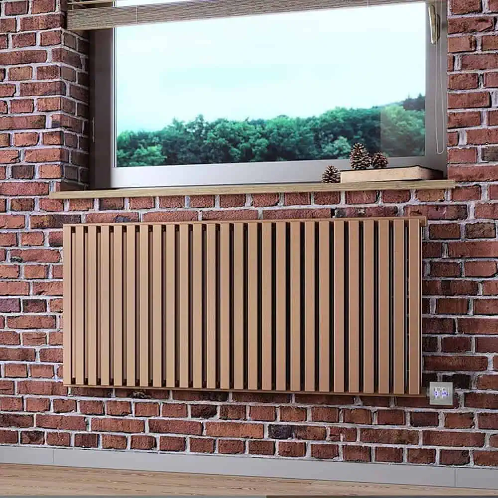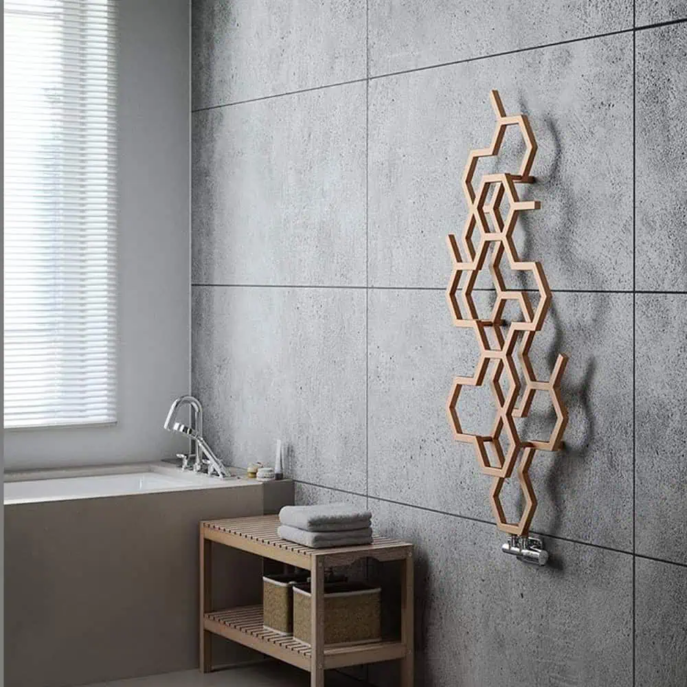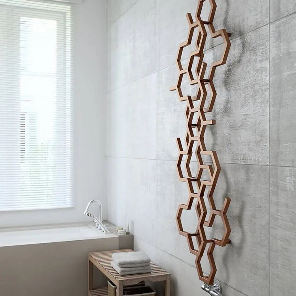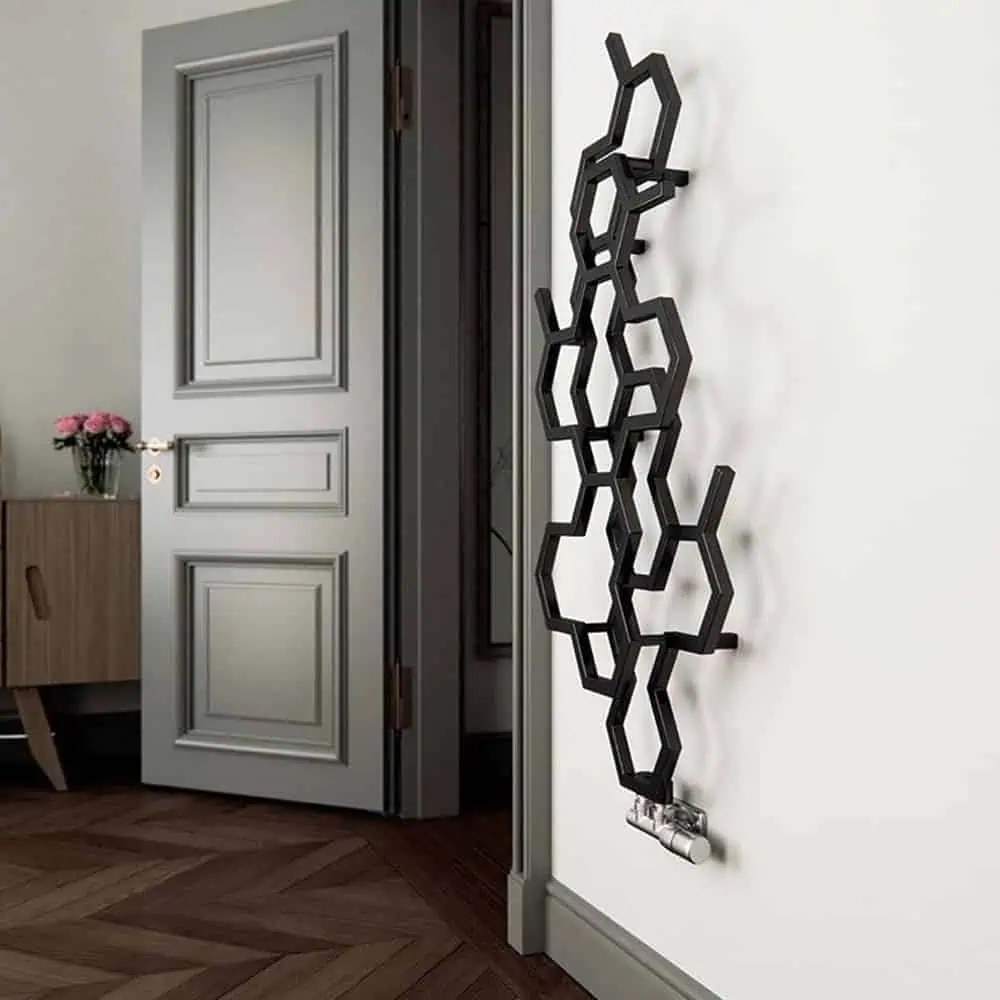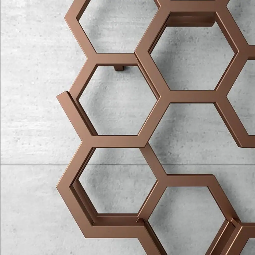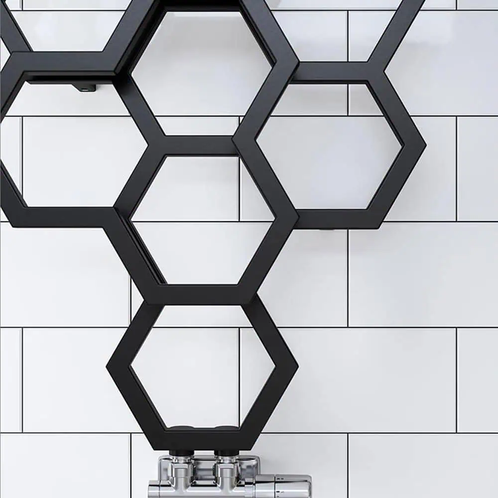 > Honeycomb style Designer Radiator with unique double layers and stylish random gaps in the hexagons.