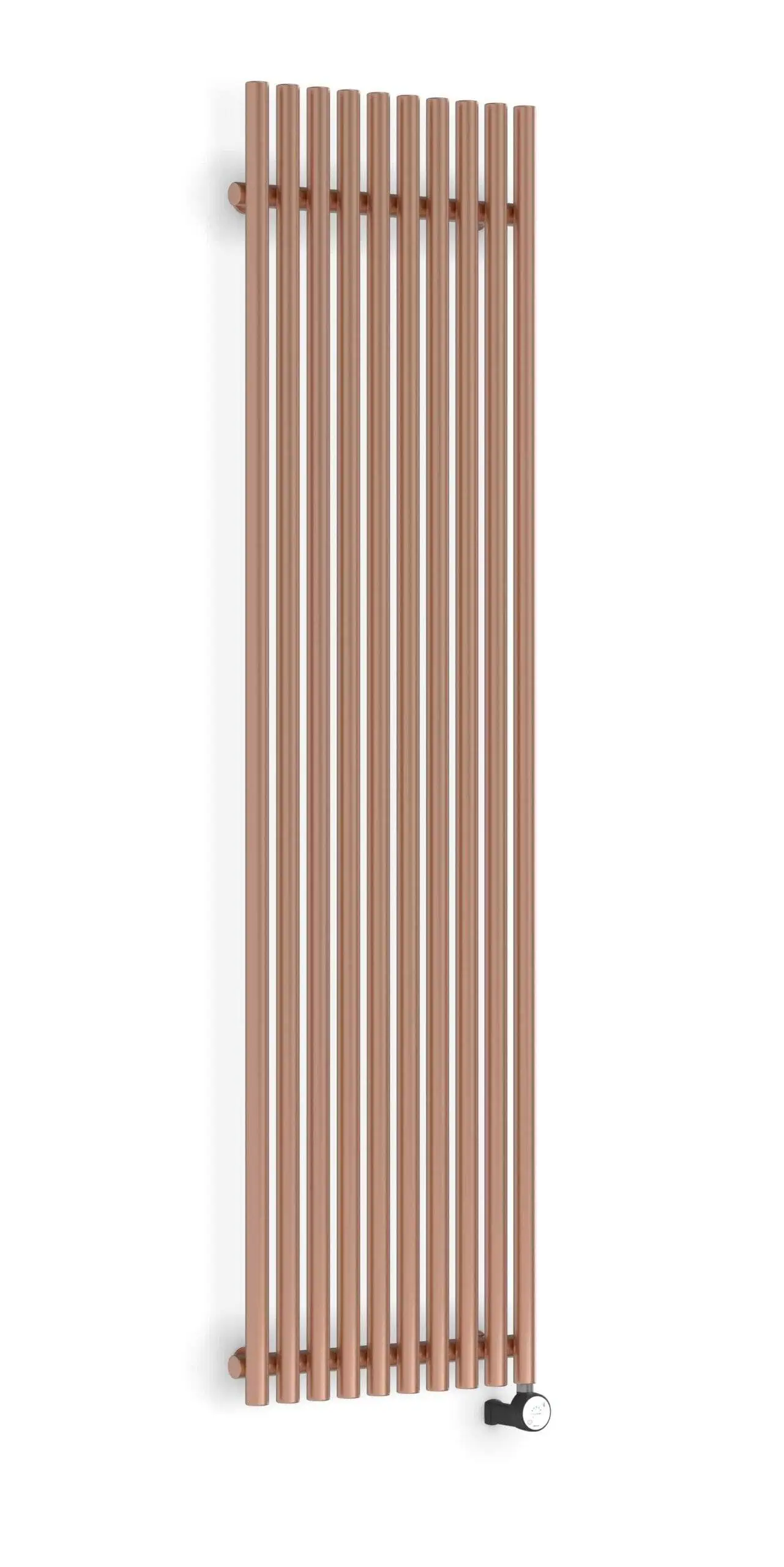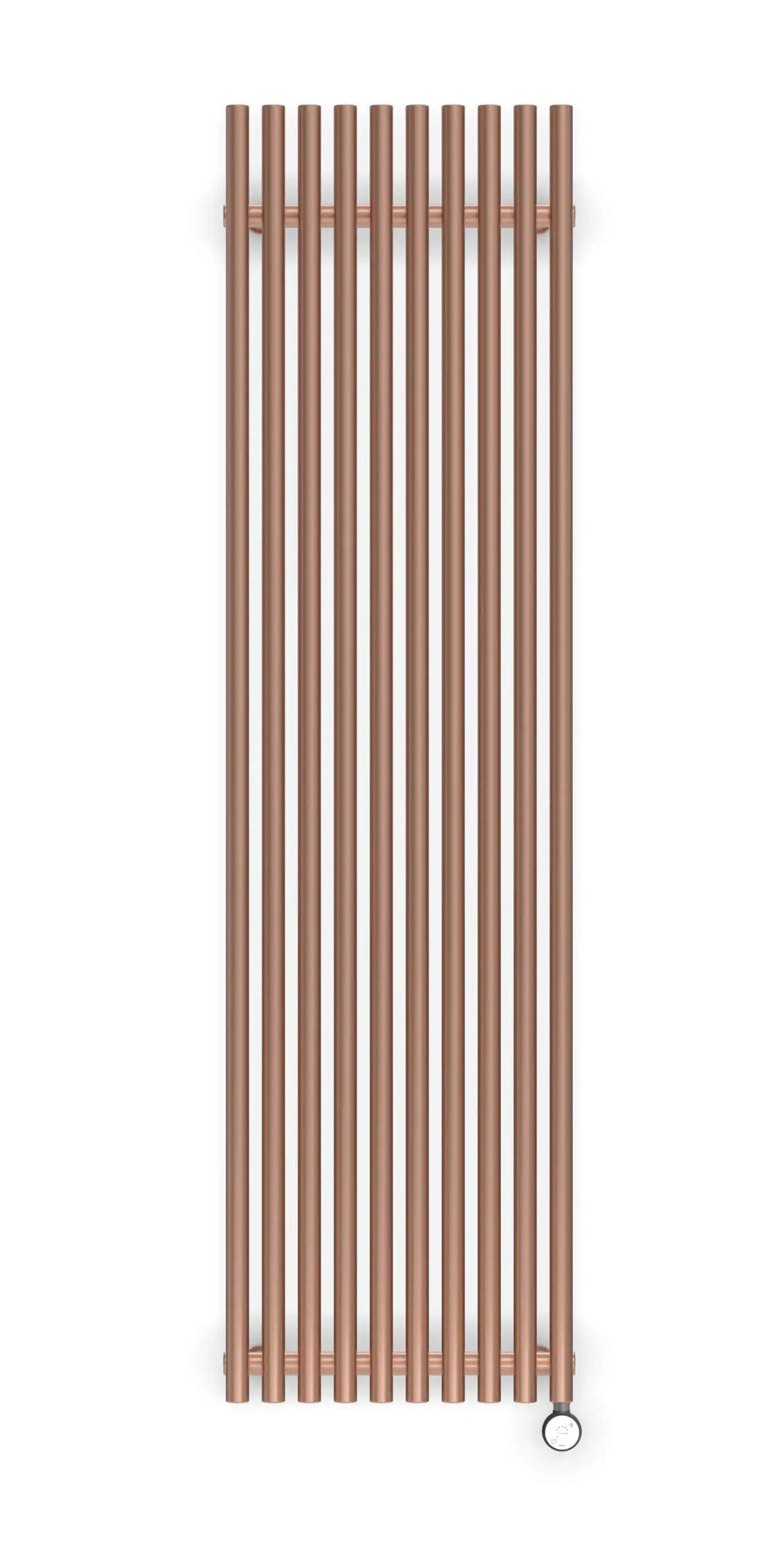 Smooth, matt, copper, oil filled, 23mm cylindrical slim bars, electric radiator, supplied pre fitted with the Terma MOA Blue heating element – fully thermostatic (internal or ambient room temperature) and full operational control and 7 day timer via Bluetooth from smartphone/tablet (android/iOS only).
